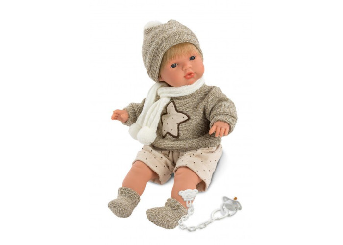 Автентичні і ідеально відтворені форми тіла пупсів і ляльок, а також деталі особи, такі як очі, губи, волосся, напевно порадують будь-яку маленьку і велику принцесу! Відмінний вибір високоякісного одягу, їх колір, вирізка, фактура і численні деталі роблять ці ляльки схожими на живих і красивих компаньйонів наших дитячих ігор. Sasha виконаний з ніжного, приємного вінілу. У нього м'який живіт, заповнений підкладкою. У ляльки є соска, при вийманні якої вона плаче і каже «мама, тато». У нього блакитні очі, а також блондинисте, напівдовге пряме волосся з чубчиком. Саша одягнений у светр кольору коричнево-білого меланжу з пришитою зіркою, а також шортики до колін кремового кольору. У комплект також входить шапочка кольору коричнево-білого меланжу, білий шарфик помпонами, а також чарівні шкарпетки.