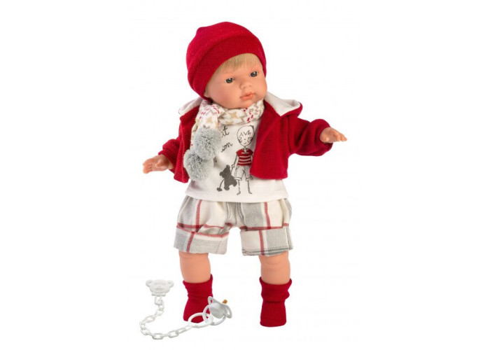 Лялька відомого іспанського бренду Llorens - це відмінна якість, безпечні гіпоалергенні матеріали, висока реалістичність і гарний одяг! Лялька Саша Llorens - чарівний хлопчик зі світлим волоссям, одягнений в картаті шортики, теплу червону кофточку і шапочку з помпоном. У ляльки мягконабивне тіло, виконане з ПВХ з наповнювачем з синтетичного волокна. Руки. ніжки і голова вінілові без запаху. Гра з лялькою прищеплює дитині почуття турботи, відповідальності. Якщо натиснути на животик малюка, то він починає кликати маму і тата, а також голосно плакати. Лялька упакована в декоративну картонну коробку.