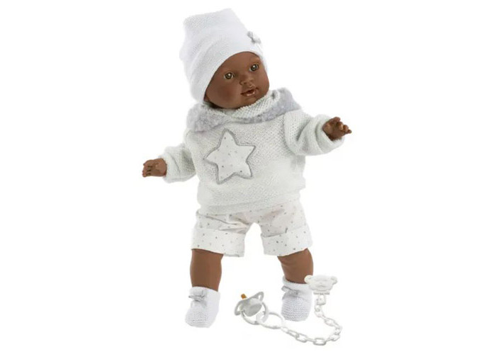 Лялька Llorens Sirham хлопчик в світлому одязі. Він вміє кликати матусю і татка, і без пустушки плакати. Батарейки в комплекті. Звук відключається.
