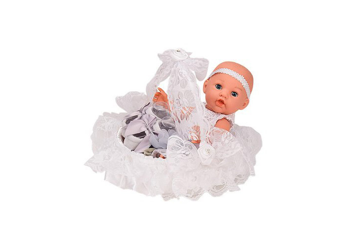 Милий пупс у розкішному вбранні та прикрашеному мереживом кошику — чудовий подарунок для маленької дбайливої дівчинки. У комплекті модна пов'язка, шкарпетки та пляшечка, з якої зручно поїти пупса водичкою. Іграшку можна взяти із собою в подорож, у гості або на прогулянку. Ігри з такими ляльками розвивають у дітей відчуття відповідальності, уяву та навички спілкування. У комплекті: - кошик - пляшечка - носочки - корона