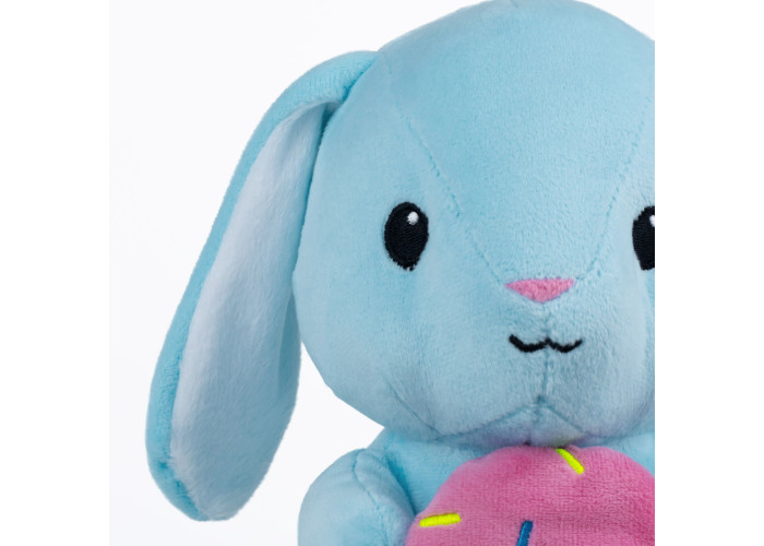 - м'яка іграшка зайчик Хрумтик пошита із блакитного та рожевого мікроплюша, а всередині - пухнастий гіпоалергенний холлофайбер, що сприятливо впливає на відчуття при торканні