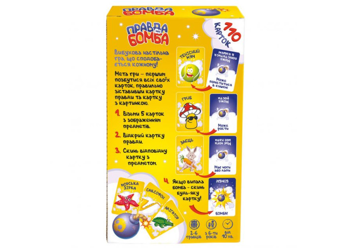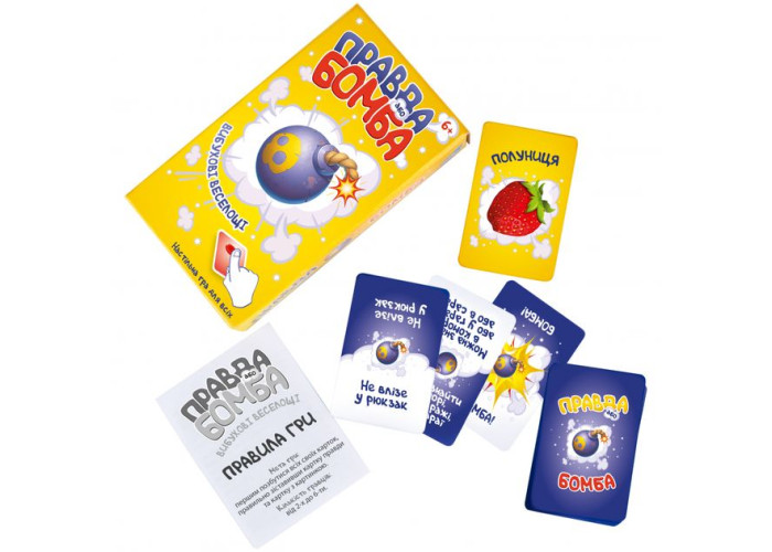 «Правда або Бомба» - вибухова настільна гра, що сподобається кожному! Гра розвиває моторику, реакцію, асоціативні навички і дарує безліч позитивних емоцій. Мета гри: вірно співвіднести картку правди і картку з зображенням та першим позбутися всіх своїх карт. Наприклад: хто з гравців швидше за інших знайде картку з предметом, який може поміститися в кишені? Або відшукай зображений предмет, який може бути солодким на смак або м'яким на дотик? Випала картка «Бомба» - швидше скидай будь-яку карту!