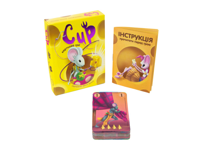 «Сир» - карткова настільна гра на хитрість для 2-5 гравців від 8 років. Хитрі і кмітливі миші запримітили на столі сир і вже вишикувалися в чергу за ним. Але раптово з'явився кіт готовий позмагатися за ласий шматочок. Адже сир в грі є переможними балами. Гра проходить в три раунди. Учасники отримують по 8 карти з мишами і котами, а потім жеребом визначають хто буде ходити першим. Карта першого гравця визначає «головний» колір раунду. І пам'ятайте, що колір карти важливіше номіналу. «Сир» підходить для гри в сімейному та дружньому колі, а компактну коробочку можна захопити з собою куди-завгодно.