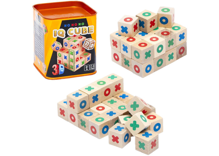 Гра настільна IQ Cube, упаковка - тубус із металевими кришками. У комплекті: 27 дерев'яних кубиків із зображеннями хрестиків та нуліків, інструкція. Розмір грані кубика – 1,8 см. В основі класична гра Хрестики-нуліки. Мета гри: встежити за всіма гранями куба і прорахувати ходи так, щоб виставити ряд із хрестиків або нуликів свого кольору, одночасно завадивши при цьому противникам зробити те саме.