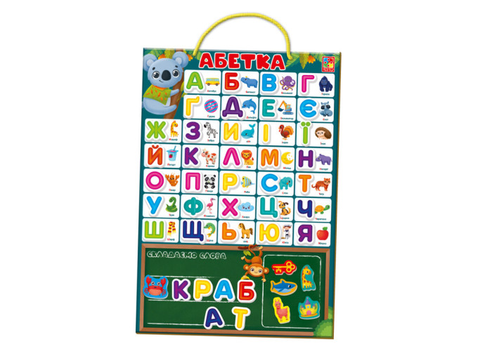 Набір містить гральну основу та кольорові магніти. На фігурних магнітах зображено букви, а на прямокутних – букви, слова та різні ілюстрації. Проговорюйте разом з дитиною назви літер, складайте та читайте слова.