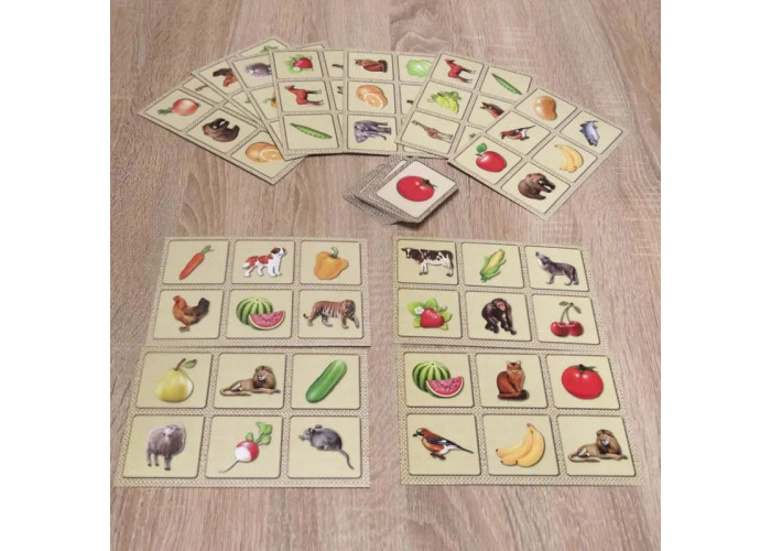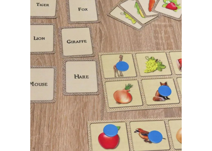 У коробці знаходиться набір з 36 карток з найбільш вживаними словами англійської мови за трьома тематичними групами: овочі, фрукти і тварини. З одного боку картки зображена ілюстрація, а з іншого - англійське слово, яке є назвою даної картинки. Завдяки чому у дитини формується правильний зоровий образ, який допомагає розвитку навичок пасивного читання і письма. Також в комплект входить 12 планшеток по 6 малюнків на кожній, на звороті якої, прописані англійські слова в кожній ілюстрації.