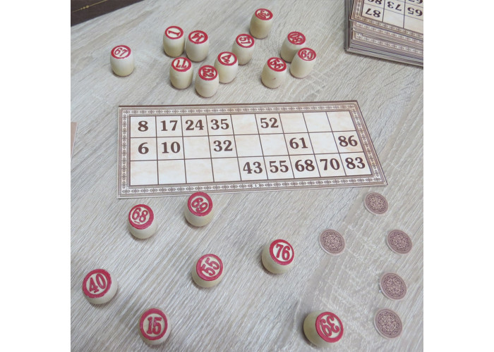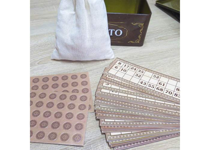 Комплектація: дерев'яні барильця – 90 шт., мішечок з тканини – 1 шт., картонні картки – 24 шт., картонні фішки – 80 шт.