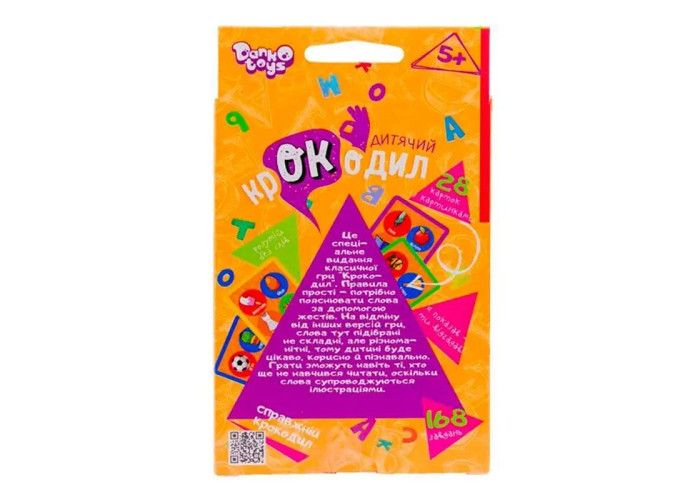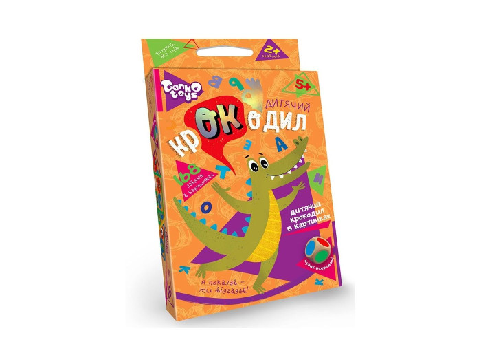Цікава дитяча класична гра "Крокодил" від "Danko Toys". Гра представлена у вигляді карток з картинками, яку гравець повинен пояснити іншим за допомогою жестів, міміки, при цьому не вимовляючи жодного слова. Такий процес доставляє масу веселощів компанії та розвиває фантазію, креативність та акторський потенціал дитини.