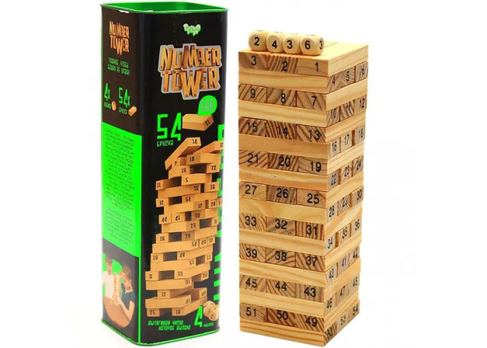 Розвиваюча настільна гра Дженга "NUMBER TOWER" NT-01 – популярна забава, яка приверне увагу Вашого маленького розумника, посприяє розвитку уяви, дрібної моторики, кмітливості і координації рухів. Цікавий процес складання башточки з окремих, дерев'яних брусочків захопить дитину на довгі години. Гра підходить для змагання в компанії з рідними і близькими, як для затишного сімейного вечора, так і для веселого, святкового заходу з друзями. Мета гри – по черзі витягати з високої споруди (вежі) по одній детальці, пересуваючи її догори. Той гравець, у якого вежа впаде першою, стає переможеним. У гру можна грати удвох, або невеликою компанією, що додасть проведенню часу азарту і веселощів. Ігровий набір розроблений з міцного, екологічно чистого дерева, без використання токсичних барвників та емалей, здатних викликати у дитини алергічні реакції. Гра орієнтована на дітей від п'яти років, оформлена російською мовою, розвиває спритність, кмітливість, рівновагу і терпіння.