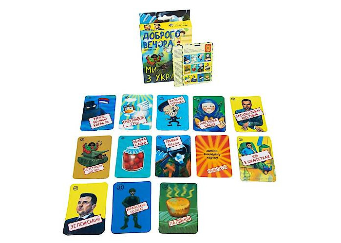 Це карткова гра, в якій "київські гопники" та "безстрашні цигани" перебивають російський військовий корабель, "заспокійливий Арестович" справді заспокоює, а кожен гравець може поставити крапку в раунді за допомогою "паляниці". Грати дуже просто і весело, особливо якщо ви справжні українці. Всім роздають по 12 карток відкритими, які потрібно швидко запам'ятати та перевернути. А далі гравці викладають по одній картці, намагаючись викласти таку, яка буде вищою за номіналом за карти суперників. Якщо вийшло – гравець забирає всі карти. І для перемоги гравцеві потрібно зібрати якнайбільше.