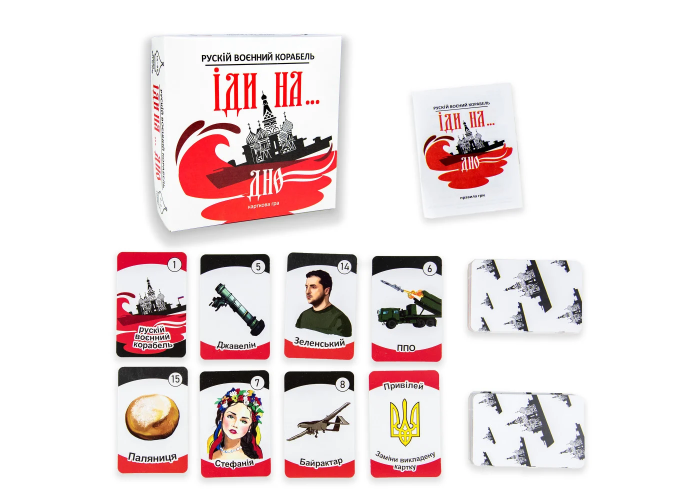 Сумнозвісний корабель вже давно пішов на дно, але згадувати про нього хочеться знову і знову. Адже це історія ніби з легенд, в яких побажання сміливого воїна «Рускій воєнний корабель іди на… дно» дуже скоро здійснилося. У цій картковій грі ми пропонуємо знову перебити ворожий корабель і виграти за допомогою Байрактарів, Конотопських відьом, Волонтерів та інших. Для цього знадобиться ваша пам'ять, уважність та компанія друзів. Гра «Рускій воєнний корабель іди на… дно» Strateg (30973) створена патріотами та стане в пригоді на будь-якій вечірці.
