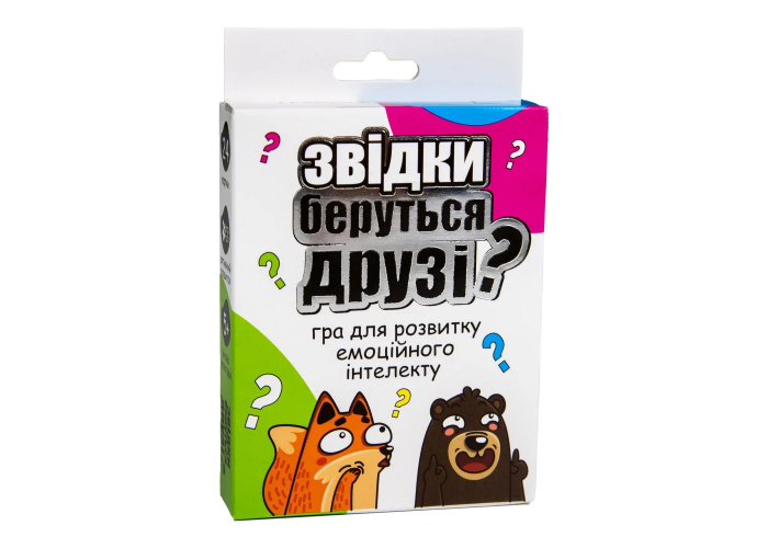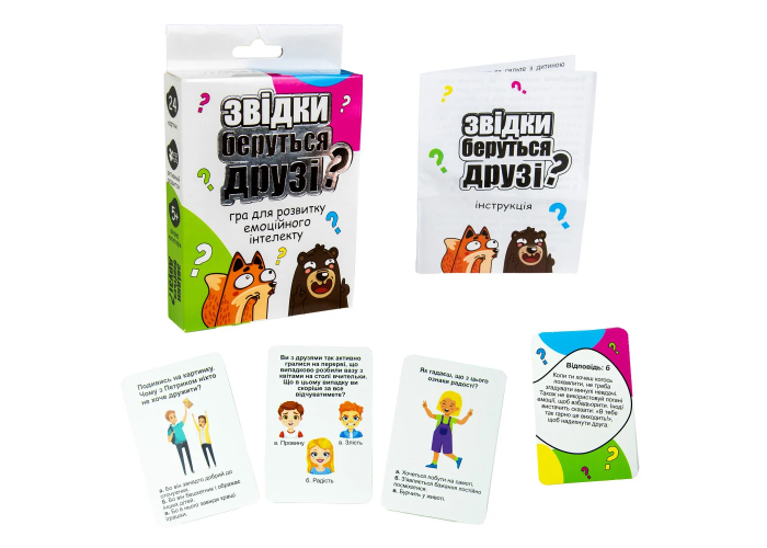 Якщо ви вже чули про таке поняття, як емоційний інтелект, то точно замислювалися над розвитком цієї навички. Особливо важливо її розвивати вже в дитячому віці, адже від рівня розвитку емоційного інтелекту залежить емоційний комфорт дитини. «Звідки беруться друзі?» Strateg (30238) – легкий спосіб у грі показати дитині, які бувають у житті ситуації і, як можна повести себе, щоб уникнути неприємностей або нікого не образити. Запитання на картках досить прості, і на зворотах можна прочитати відповідь, яка вважається найприйнятнішою у суспільстві. Можете грати наодинці, а можете грати в команді прислуховуючись до думки одне одного. Насамперед «Звідки беруться друзі?» – гра для розвитку емоційного інтелекту, але вона також розвиває комунікативні навички та дозволяє цікаво провести час.