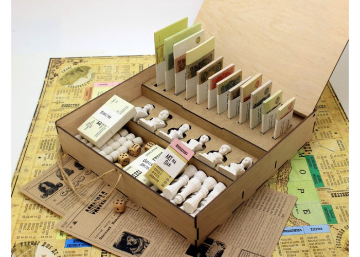 Коробка гри зроблена як посилка початку ХХ століття, зібрана в ручну.