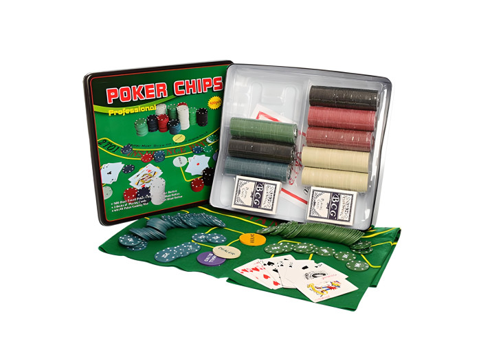 металлическая коробка, 2 бревна карт, 500 фишек с номиналом, фишки дилеров, игровое сукно.