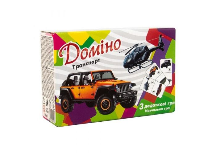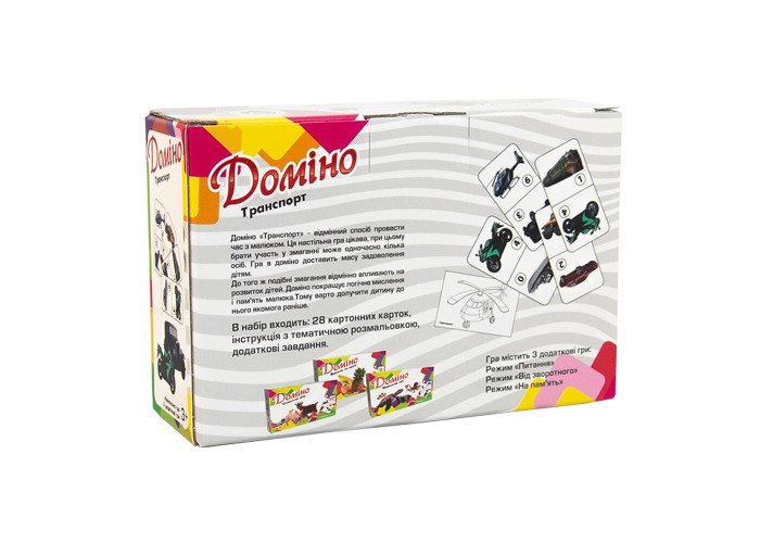 «Доміно Транспорт» - всім відома настільна гра в новому навчальному форматі. Тепер гри стали не тільки веселими, а й корисними. Граючи, дитина познайомиться з різними видами транспорту, поліпшить свою уважність і посидючість. Також в наборі є додаткові завдання, які допоможуть закріпити отримані знання!