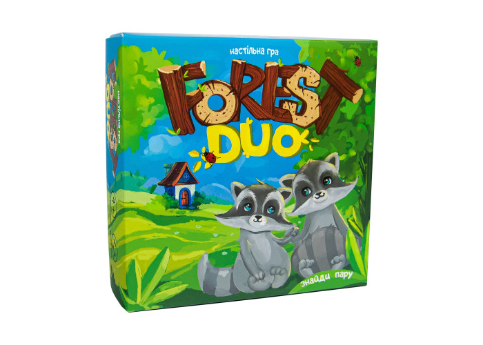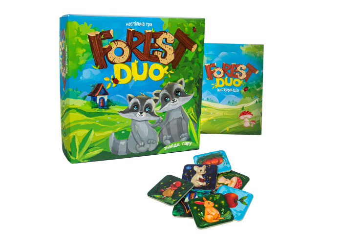 «Forest Duo» - настільна гра, що розвиває пам'ять, підходить для дітей старше 4-х років. У наборі 64 фішки, якими слід грати за принципом мемо. Розкладайте фішки сорочками вгору, а потім гравці по черзі відкривають в свій хід по дві фішки і намагаються знайти пари з однаковими малюнками. Якщо знайшли пару - забирайте фішки собі. Фішки можна використовувати для розширення словникового запасу, розповідайте малюкам про предметах, які вони будуть знаходити. Переможе гравець з найбільшою кількістю фішок. Розвивайте зорову пам'ять, уважність та діток весело і цікаво.