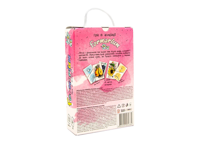 «Formarium» - фантастична карткова гра в асоціації. У грі ви знайдете 72 картки, серед яких будуть карти з малюнками і карти з різними властивостями. Мета гри - вгадувати властивості карток в центрі столу, так само, як і більшість гравців. У ситуації, коли всі гравці виклали однакову властивість, або все різне - ніхто не заробляє бали. З цією грою ви переконаєтеся, що кожна людина в однакових предметах бачить абсолютно різні форми і характеристики! Це дуже захоплююче!