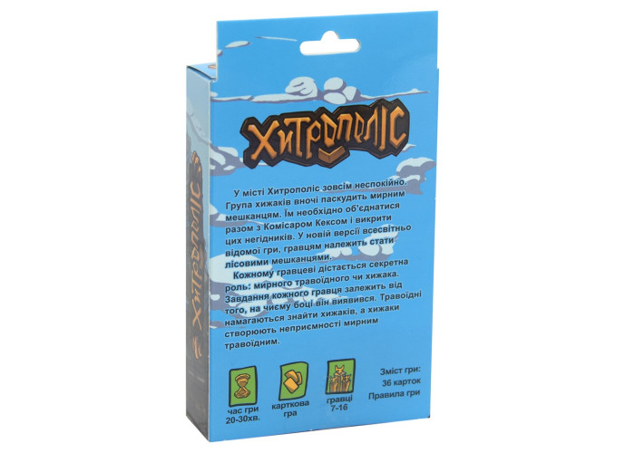 У нічній тиші на вулицях міста Хітрополіс з'являються хижаки-зловмисники, які загрожують мирним мешканцям. Виявити і знешкодити злочинців - завдання проникливого Комісара Кекса в грі «Хітрополіс». Являє собою різновид гри "Мафія", в якій гравці можуть вибрати різні ролі - хижака або мирного мешканця. Комісару необхідно виявити хижаків, провівши розслідування. Гра викличе інтерес з перших ходів! В інструкції наведені правила гри і як визначити переможця. Настільна гра для компанії до 16 осіб - зможе зацікавити не тільки дітей, а й дорослих, дасть можливість цікаво провести час всій родині, при цьому розвинути уважність, стратегічне мислення і пам'ять. Карти з ролями і завданнями виконані з картону.