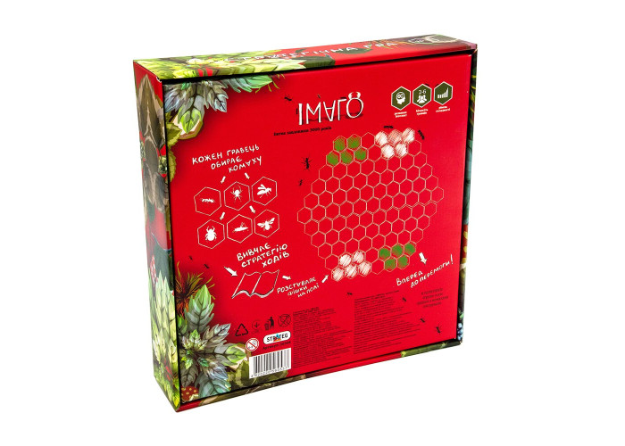 Продумати стратегію, тактичні ходи, підготувати наступ і перемогти противника - це завдання які повинен виконати дитина в стратегічній настільній грі «Імаго». Грати можна в компанії від 2 до 6 осіб, на великому ігровому полі розмірами 75 х 75 см, виконаному у вигляді пазла, на якому розташовуються армії і проводяться битви. Гравці можуть об'єднуватися в команди. Кожен з гравців може вибрати один з шести видів комах - коників, жуків, бджіл. Кожен вид має унікальні бойовими вміннями і здібностями - швидкість, сила, дальність. Всього у кожного гравця по 5 загонів юнітів певного виду. З огляду на особливості юнітів необхідно продумати стратегію боїв для захоплення територій супротивників або блокування його загонів. Відповідно до правил і можливостей комах, необхідно здійснювати ходи і проводити тактичні бої для виконання стратегічного завдання. Перемога чекає гідного! Правила прості, але гра захопить учасників з першої партії.