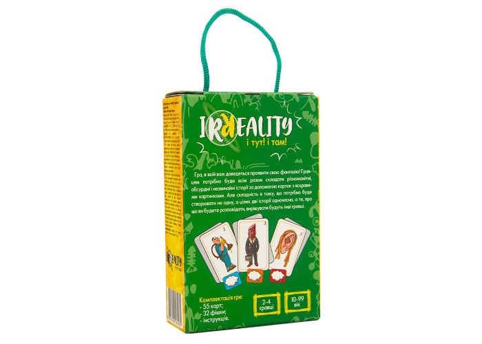 «Irreality» - справжнісінька фантазійна гра. Ви з друзями станете творцями двох історій - в світі людей і в світі тварин. А відбуватися це буде наступним чином: гравець, якому слід ходити називає для якого світу він буде складати пропозицію, а його сусід підкидає йому карту із зображенням, яке слід згадати в своїй пропозиції. І до речі, пропозиції повинні бути максимально придатними під заданий «світ», тому що ведучий може його не зарахувати. Настільна гра дуже цікава і захоплююча. Кожен гравець повеселитися від душі!