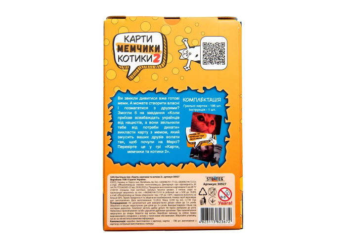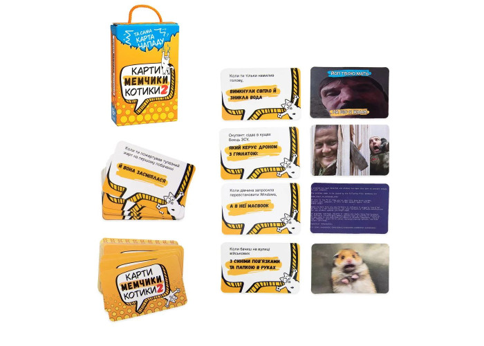 - Комплектація: 196 карт (70 питань, 126 мемів), інструкція.
