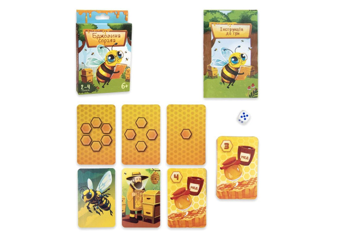 - Комплектація: 42 картки з медом, 6 з пасічником, 6 з шершнем, кубик, інструкція.