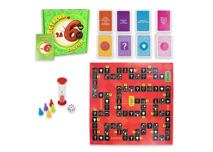 - Комплектація гри: картонні гральні картки – 220 шт., інструкція — 1 шт., ігрове поле – 1 шт., пісочний годинник – 1 шт., кубик – 1 шт.