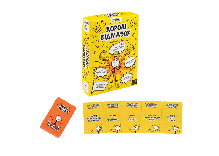«Королі відмазок» — дотепна настільна гра на уяву та імпровізацію, яка перетворить звичайний вечір на шоу сміху й креативу. Гравці отримують картки з найдивакуватішими звинуваченнями й мають вигадати найпереконливішу відмазку, щоб довести, що вони тут ні до чого.