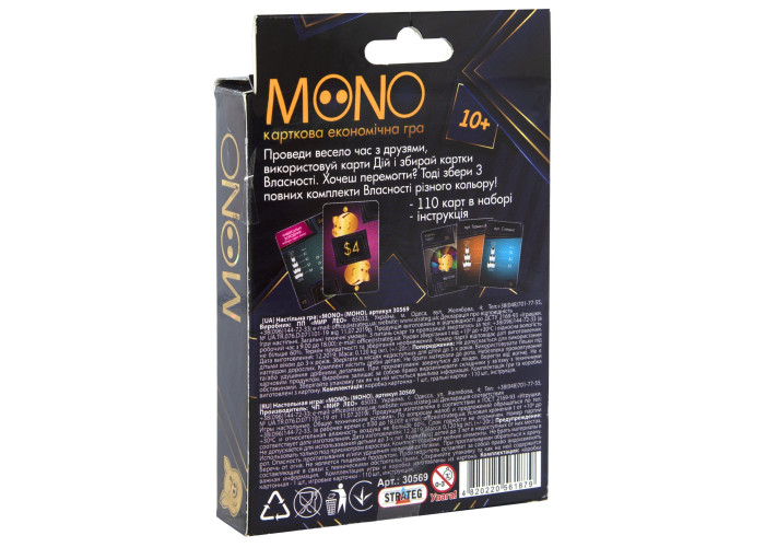 Настільна гра MONO (Моно) - це економічна гра, з якої ти можеш відчути себе підприємцем. Власні володіння, заощадження і взаємодія з партнерами - ти спробуєш все! Гра відточує навички володіння бізнесом, стратегічного мислення і припаде до смаку невеликої компанії друзів. Всього за 20 хвилин ти можеш як стати власником декількох володінь і перемогти, так і зовсім «розоритися».
