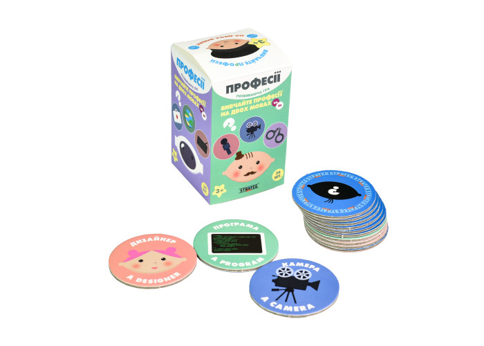 Гра “Професії” - навчальна настільна гра, створена спеціально для маленьких карапузиків. Вона складається з 36 тайлів, кожен з яких містить професію та два пов'язаних предмети з нею.