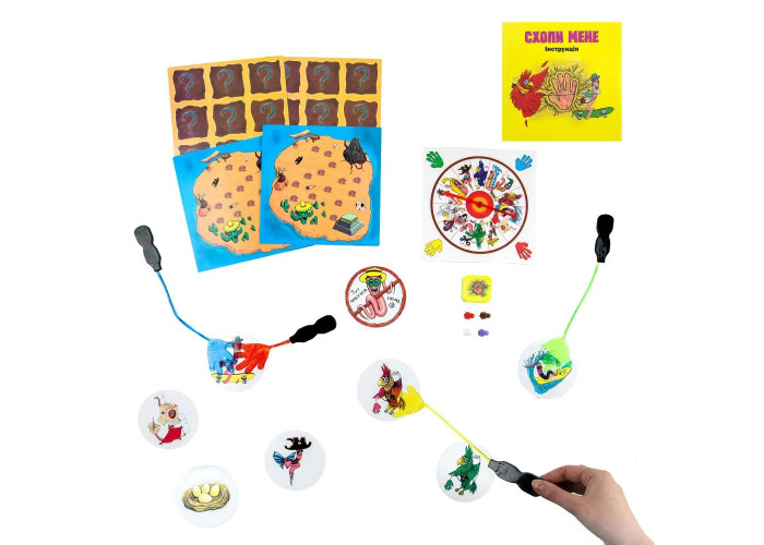 Комплект: липкі долоні – 4 шт., круглі картки – 15 шт., двосторонні планшетки – 4 шт., ігрові фішки – 4 шт., рулетка зі стрілкою, ігрові жетони, інструкція.