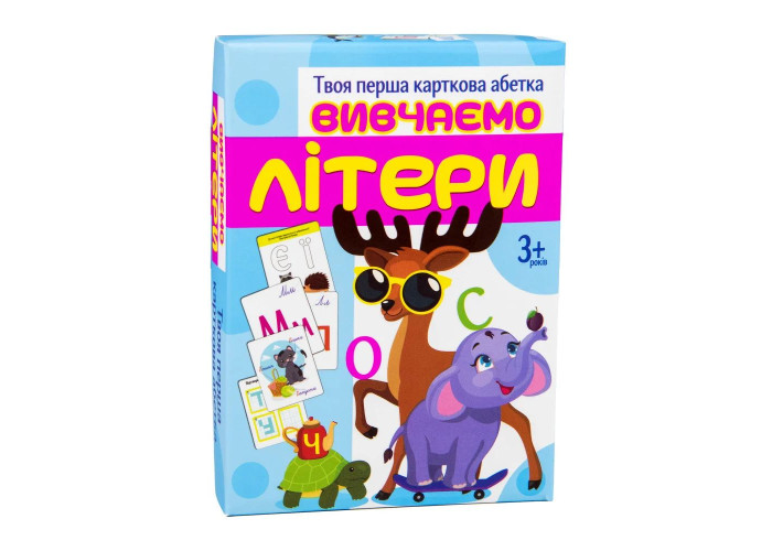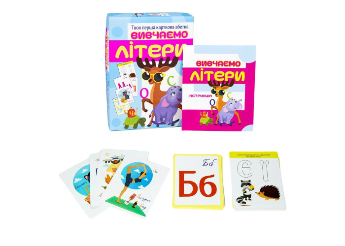 Набір складається 48 яскравих великих карток 4 типів, завдяки яким малюк навчиться розпізнавати друковані та рукописні літери, зможе самостійно перемалювати їх та навіть розпізнавати у словах. Вміло підібрані завдання допоможуть розвинути розумові здібності, а яскраві зображення з легкістью привернуть його увагу.
