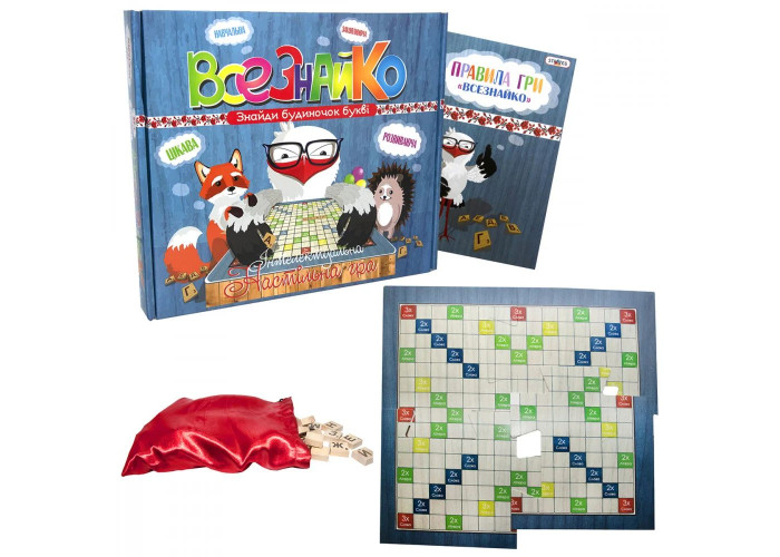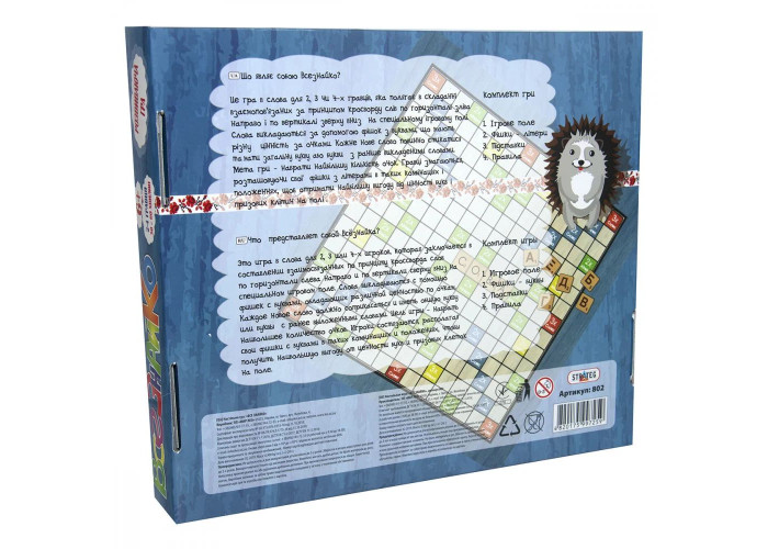 Набір включає ігрове поле з високоякісного щільного картону у вигляді пазлу з 4 частин, дерев’яних фішок з літерами в сумці та інструкція з детальними правилами гри. Суть гри полягає в тому, щоб скласти слова з центру ігрового поля горизонтально або вертикально. Слова повинні перетинатися за принципом кросвордів, тобто мати мінімум одну або кілька спільних букв. За складені слова гравцям присуджуються бали. Крім того, кожна фішка з буквою має певне значення. Це також потрібно враховувати, щоб набрати максимальну кількість балів.