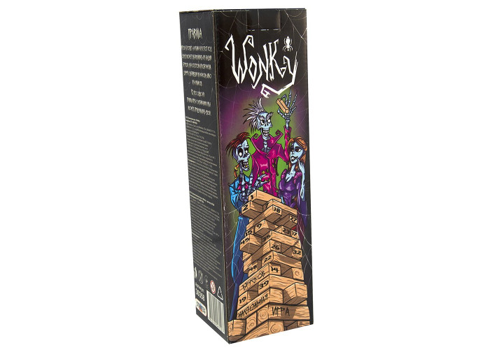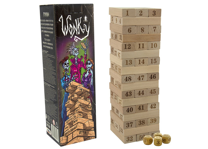 Захоплююче провести час компанії від 2 до 4 осіб допоможе настільна гра «Wonky». Чи зможе зацікавити не тільки дітей, а й дорослих, дасть можливість цікаво провести час всій родині і при цьому розвинути пам'ять, уважність, почуття об’єму, спритність і розважитися. Являє собою різновид відомої гри Дженга або падаюча вежа. Збирається вежа з використанням 48 однакових за розміром блоків, на які нанесені різні цифри. Кожен учасник кидає чотири кубика, і відповідно до випали значеннями, повинен отримати необхідну кількість блоків, після чого передати хід. Програє той учасник, після ходу якого вежа руйнується. Правила прості, але гра захопить учасників з першої партії. Можна урізноманітнити гру, придумавши свої правила. Блоки виконані з дерева.