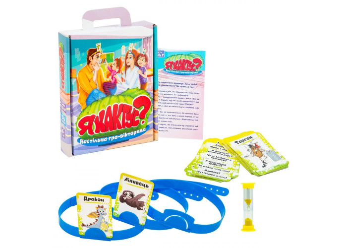 Ваше завдання – вгадати, який ви предмет чи тварина. Кожен гравець вибирає одну картку, не знаючи, що зображено на ній, і закріплює за допомогою обруча на голові. Далі, по підказках інших гравців, за відведений час потрібно вгадати, що зображено на вашій картці. Для відліку часу в комплекті є пісочний годинник. Гравець, який правильно відповів на запитання, отримує бонусні очки Якщо відповідь неправильна – хід передається іншому гравцю.