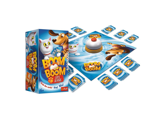 Boom Boom - це швидка настільна гра, в якій кожен гравець намагається зібрати стоси з однаковими картами. Під дзвінкий звук дзвіночка всі гравці починають полювання на карти з ігрового поля. Переможцем стає той, хто першим збере однакові карти з собаками та кішками у всіх своїх чарках!