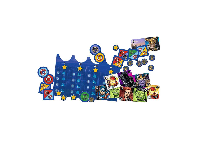 10 жетонов идентификации, 60 плиток Мстителей, стартовая плитка, 14 маркеров Таноса, 4-точечные маркеры, двусторонняя помощь/табло для подсчета очков, 5 жетонов Мстителей, инструкция.