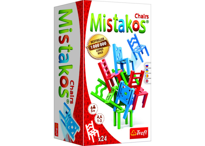 Нова версія культової аркадної гри Mistakos, цього разу зі стільчиками у головній ролі! Наберіть мінімально можливу кількість штрафних очок або позбудьтеся стільчиків даного кольору якомога швидше, одночасно створюючи загальну вражаючу структуру. Відмінне задоволення гарантоване - тепер також і для більшої групи! Пам’ятайте, що ви можете поєднувати ігри із серії Mistakos. Грайте одночасно зі стільцями та сходами та створюйте ще більш ефектні конструкції!