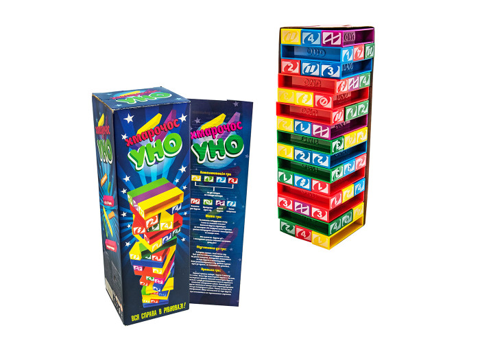Весела розвага для компанії від 2 до 10 чоловік - гра «Хмарочос УНО». Настільна гра зможе зацікавити не тільки дітей, а й дорослих, дасть можливість цікаво провести час всій родині і при цьому розвинути пам'ять, уважність, почуття обсягу, спритність і розважитися. Являє собою різновид відомої гри Дженга або падаюча вежа. Збирається вежа з використанням 45 однакових за розміром блоків. Перший учасник повинен витягнути один з блоків знизу і перекласти наверх, після чого передати хід. На відміну від класичної гри на блоках нанесені різні цифри і значки відповідно до значення яких повинен бути виконаний хід наступного гравця. Програє той учасник, після ходу якого вежа руйнується. Правила прості, але гра захопить учасників з першої партії. Мова українська.