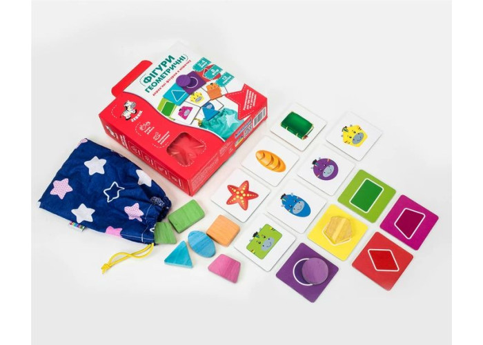 Вивчайте геометричні фігури в цікавій ігровій формі. Вибирайте будь-яку картку і шукайте в мішечку навпомацки фігурку, зображену на цій картці. Варіантів гри дуже багато. Підбирайте фігурку, яка асоціюється з малюнком на картці, говоріть малюкові назву цієї фігури, а він нехай повторює за вами. і т. д. Гра розвиває дрібну моторику, пам’ять, увагу, тактильні відчуття і логічне мислення.