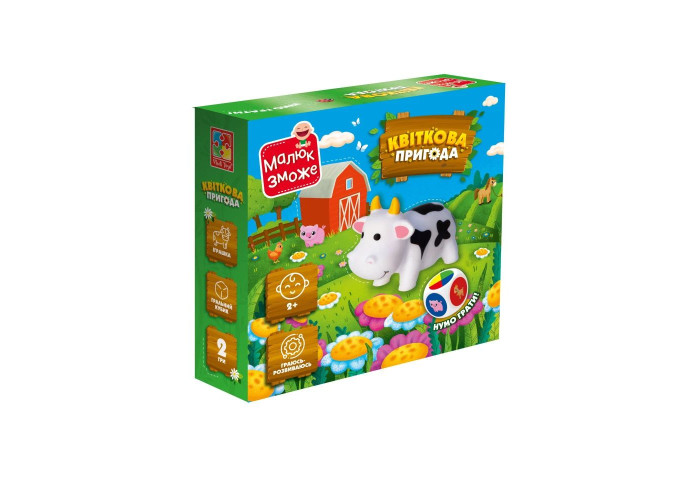 Комплектація: іграшка корівка, гральне поле, 4 фігури тварин, 14 фішок, наліпки, гральний кубик, правила гри.