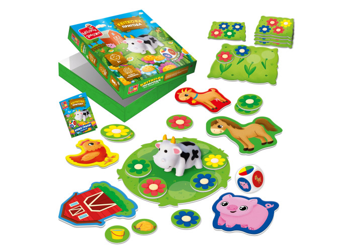 игрушка коровка, игровое поле, 4 фигуры животных, 14 фишек, наклейки, игральный кубик, правила игры.