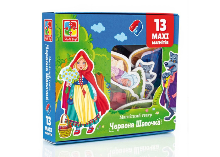 Влаштуйте справжню театральну постанову у себе вдома! Сюжет улюбленої казки «Червона Шапочка» та магніти з персонажами — у наборі.