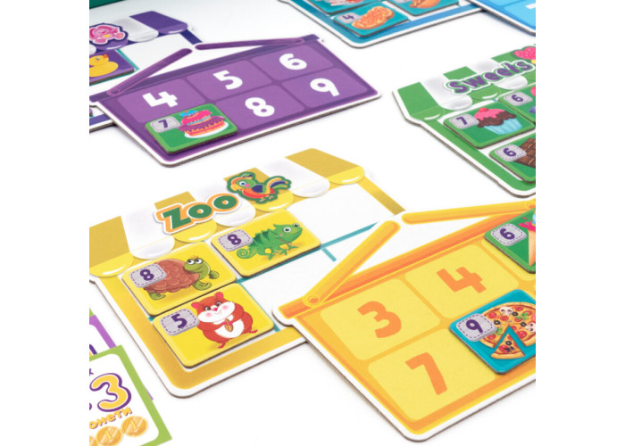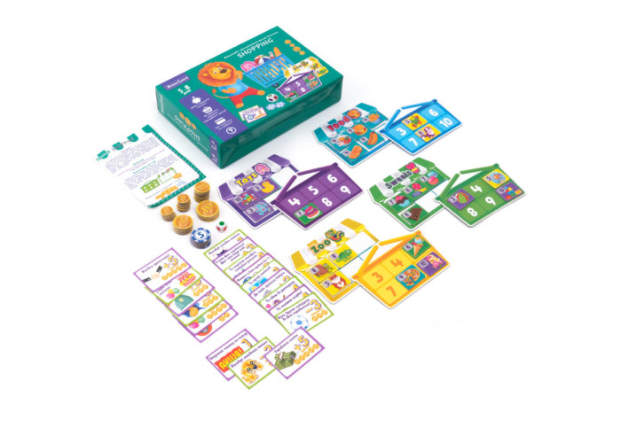 Комплектація: 4 картки з магазинами, 4 картки з кошиками, 84 деталі, 1 гральний кубик, 18 карток із завданнями, інструкція.