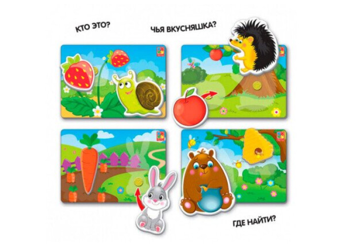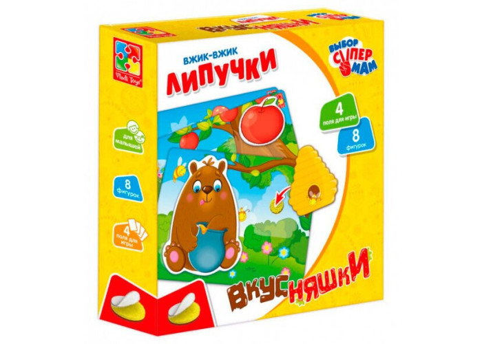 Весело провести дозвілля пропонують майстри українського бренду Vladi Toys за допомогою чудової настільної гри з липучками «Вжик-вжик. Смаколики ». Така забава не тільки розважить самих маленьких, але і познайомить їх з різними тваринами, співіснують із своїм оточенням і гастрономічними пристрастями. У комплект входять чотири яскравих ігрових поля, вісім фігурок звірів і їжі, а також 16 липучок білого і жовтого відтінків. Завдання дитини - помістити їжу і звірів на правильне поле. Їжачок їсть яблука, які ростуть в саду на деревах, зайчик - морквину з городу, равлик - суницю з галявини, а ведмежа - мед з вулика. Підбираючи пари таким чином, малюк дізнається багато нової інформації, а також розвине пам'ять, логічне мислення і дрібну моторику рук.