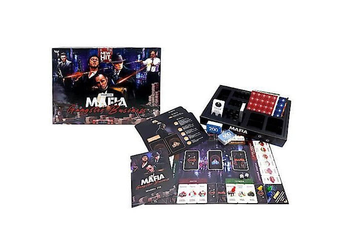 Комплектація 24 картки бізнесу, 28 картки подій, 44 картки мафії, 16 карт помічників, 180 грошових купюр, 4 фішки бомби, 96 фішок впливу, 4 фішки гравця, 2 кубики, ігровий органайзер.