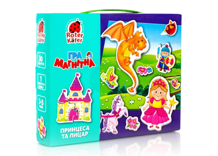 В деякому царстві, в деякій державі, жили принцеса та доблесний лицар. Стіни їхнього замку височіли над безмежною квітковою галявиною. А охороняв їх добрий і мудрий дракон! Хочете поринути у прекрасну казку разом з нашими героями? Гральний набір «Принцеса та лицар» містить магнітну дошку, із зображеним на ній сюжетом, і 30 тематичних магнітів. Прикріплюючи їх до дошки, дитина створить свою неповторну історію. Придумуйте нові події і діліться ними один з одним! Всі магніти об'ємні, їх зручно кріпити та знімати. В процесі гри дитина потренує уяву, фантазію, логічне мислення, мовлення та дрібну моторику. Створюйте казку своїми руками!