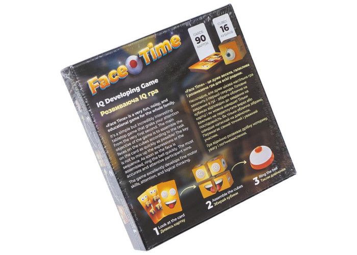 Розвиваюча настільна гра "Face Time". Комплектація картки 90шт,кубики 16шт, дзвіночок 1шт, правила 1шт. Кількість гравців: 2-4.