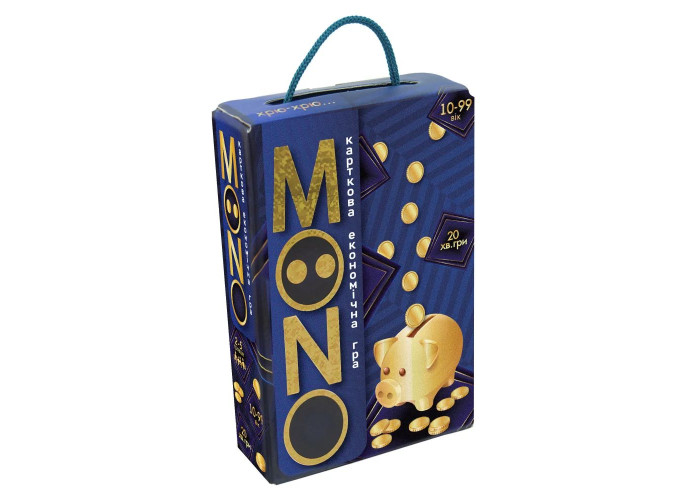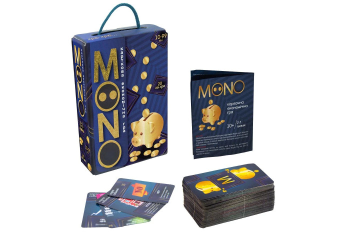 «MONO» (Моно) – карткова економічна гра, за допомогою якої можна влаштувати справжнє змагання між власниками різної власності. Щоб перемогти потрібно зібрати 3 повних комплекти Власності різного кольору. Для досягнення головної мети дотримуйтесь правил і використовуйте карти Дій, які підкинуть багато сюрпризів. На вас чекають хитрі угоди і приємні бонуси, а також шахраї і оплата заборгованостей.
