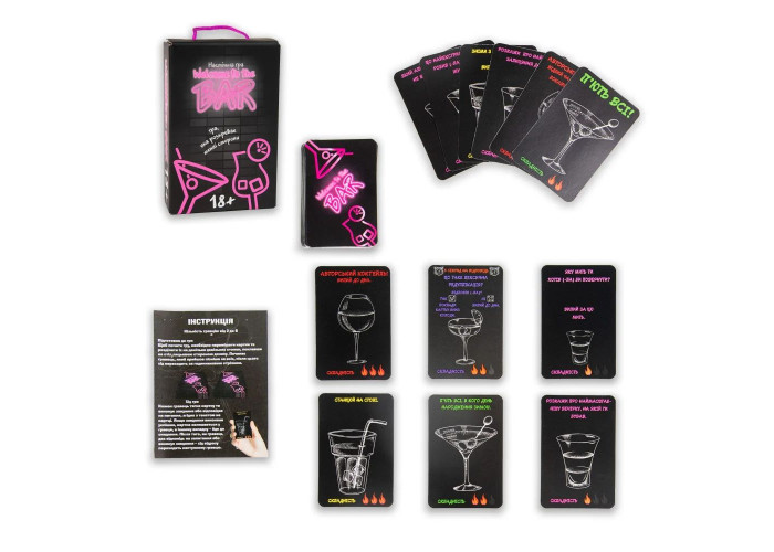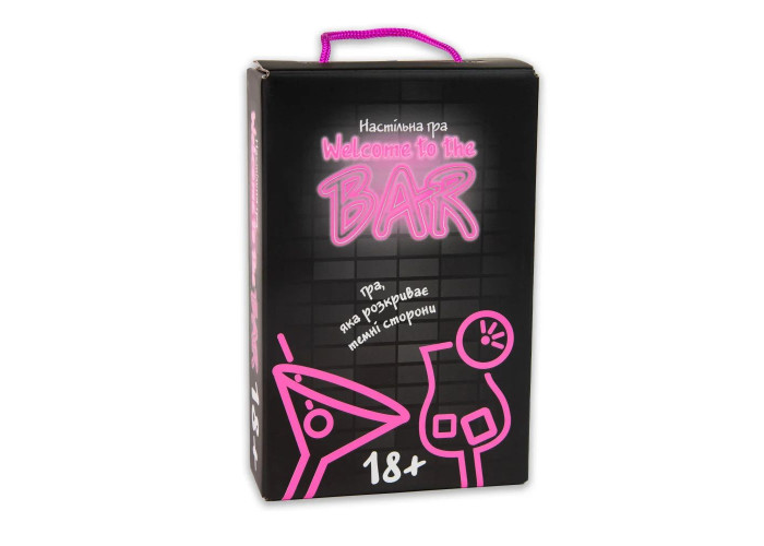 «Welcome to the BAR» – настільна гра для двох гравців або компанії. Учасники тягнуть картки та виконують різні завдання або відповідають на цікаві питання. Перемагає той, хто перший зібрав 3 картки с однаковим коктейлем. Збирайте друзів, беріть цю гру та насолоджуйтеся моментом!